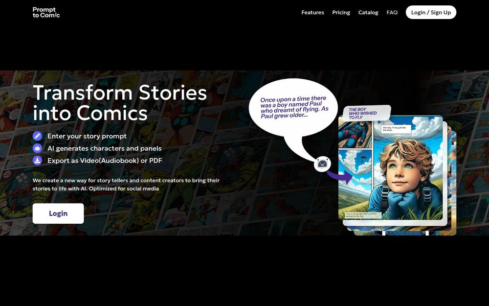 PromptToComic(PromptToComicAI)是一款以 AI 为核心的故事可视化工具,旨在将文字故事快速转化为漫画面板或有声视频。它面向社交媒体内容创作者、儿童读物作者、教育工作者以及喜欢将口述或书面故事视觉化的个人或团队。平台突出“快速生成、易于编辑、适配社媒”的设计理念,使创作者能更高效地把故事变成可分享的短视频或 PDF 漫画。