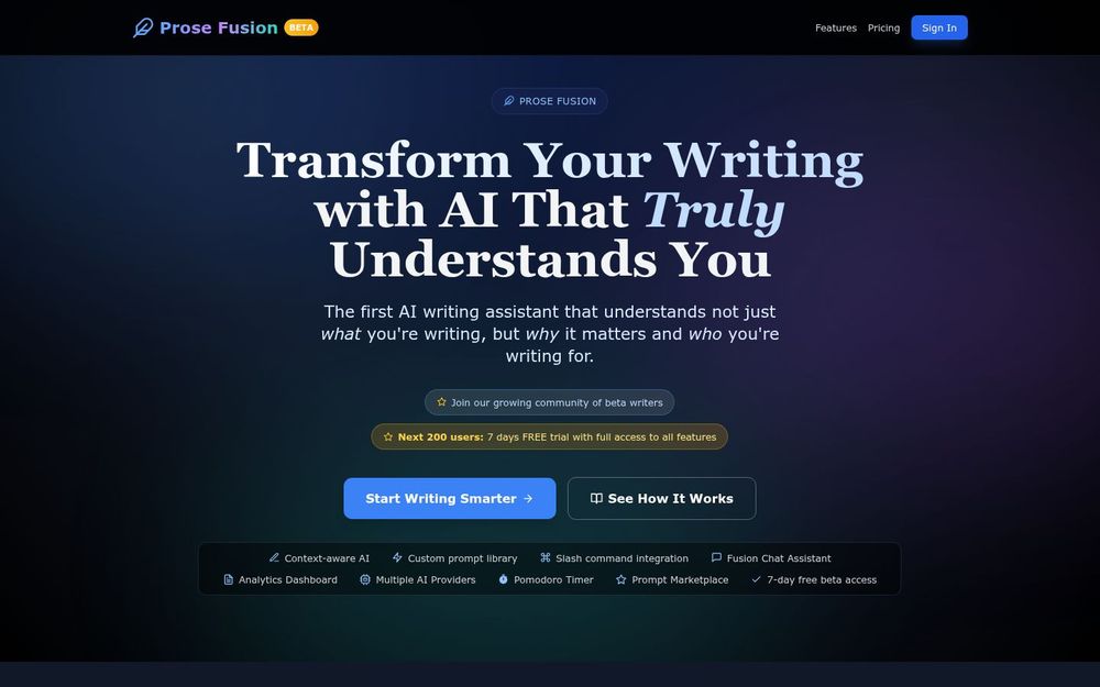 Prose Fusion 的核心优势在于将“内容”作为 AI 提示的直接输入,从而实现真正的上下文感知写作协作。对于经常在不同草稿与研究资料间切换而丧失创作节奏的作者,它能集中内容与提示,减少来回搬运;对于需要快速克服写作障碍或想要精细化风格控制的用户,个性化提示与实时助理能显著缩短从想法到成文的时间;对于喜欢社区共享与协同成长的创作者,提示市场则提供灵感与实用模板。