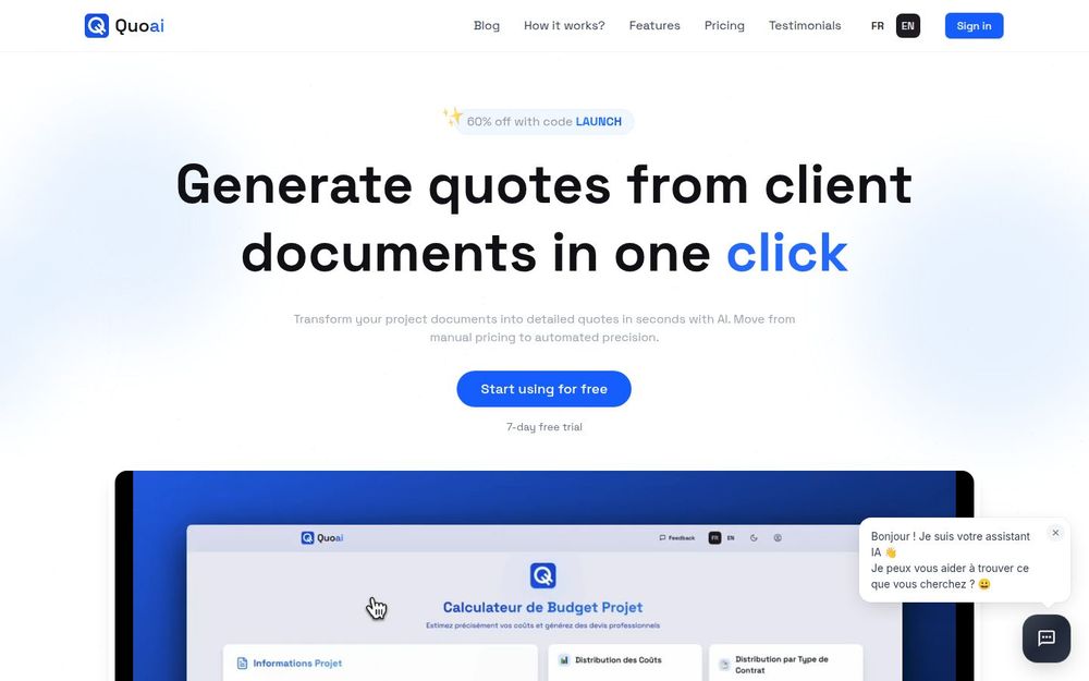 Quoai 是一款专为技术项目报价与预算编制设计的 AI 驱动工具。它能够在数秒或数分钟内将客户文档转换为完整、专业且可导出的报价单,覆盖成本计算、税务处理、团队构成建议以及可视化的费用分布。Quoai 适用于代理机构、独立开发者和希望提升投标效率的中小型团队,目标是用自动化与智能化减少人为估算误差并提升成交率。