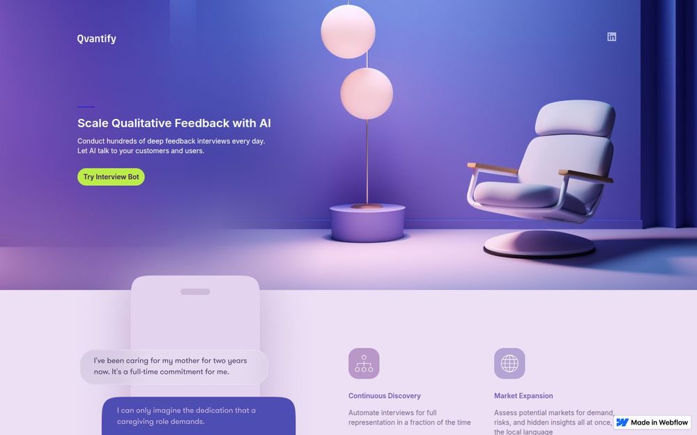 Qvantify 是一款面向企业与研究团队的 AI 驱动定性访谈平台,旨在将传统深度访谈规模化、自動化。通过智能化的访谈机器人,平台可以在任意设备上与用户进行富有同理心的互动,从而捕获细腻的用户反馈、验证假设并发现潜在市场机会。它兼顾调研的广度与深度,支持多语言、多场景的应用。