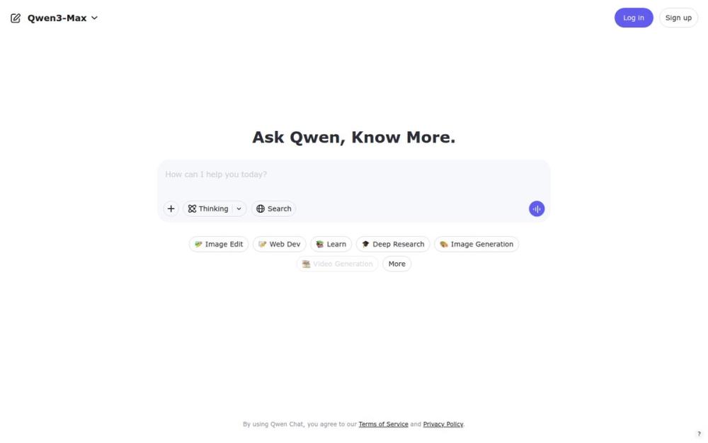 Qwen(Qwen Chat)是一个聚焦于对话交互与多模态创作的在线人工智能平台。页面口号为“Ask Qwen, Know More”,提供从日常问答到专业研究、从图像编辑到视频生成的多种功能入口,并支持移动端下载以增强使用体验与功能访问。网站同时列出了服务条款与隐私政策,表明产品在合规与用户数据保护方面的基本信息。