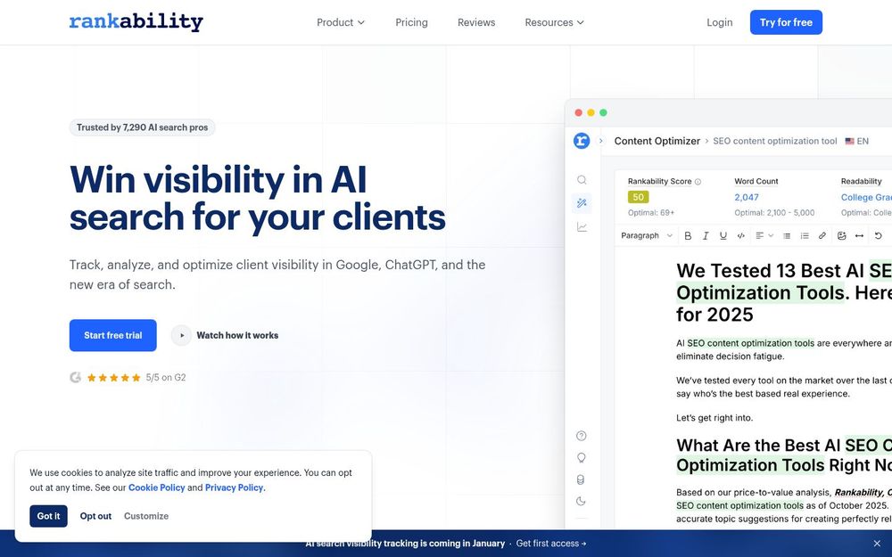 Rankability 将传统 SEO 与新兴 AI 搜索指标结合,特别适合希望在 AI 驱动的搜索生态中取得领先的机构。其基于 NLP 与 实体洞察 的自动化建议、面向团队的协作功能以及集中化的客户监控能力,使其成为希望提升内容效果与工作效率的 SEO 团队的实用工具。平台还提供免费试用与成熟的入门支持,便于团队快速验证价值并将其纳入现有交付流程。