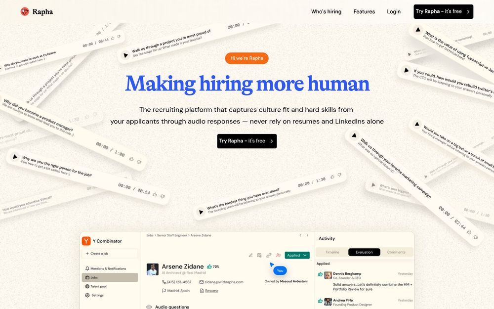 访问页面上的“Get started for free”链接,与 Rapha 团队对接即可试用。通过短期试用或小范围试点,招聘团队可以验证节省时间和提高候选人质量的实际效果,再根据反馈逐步推广到更大规模的招聘流程中。