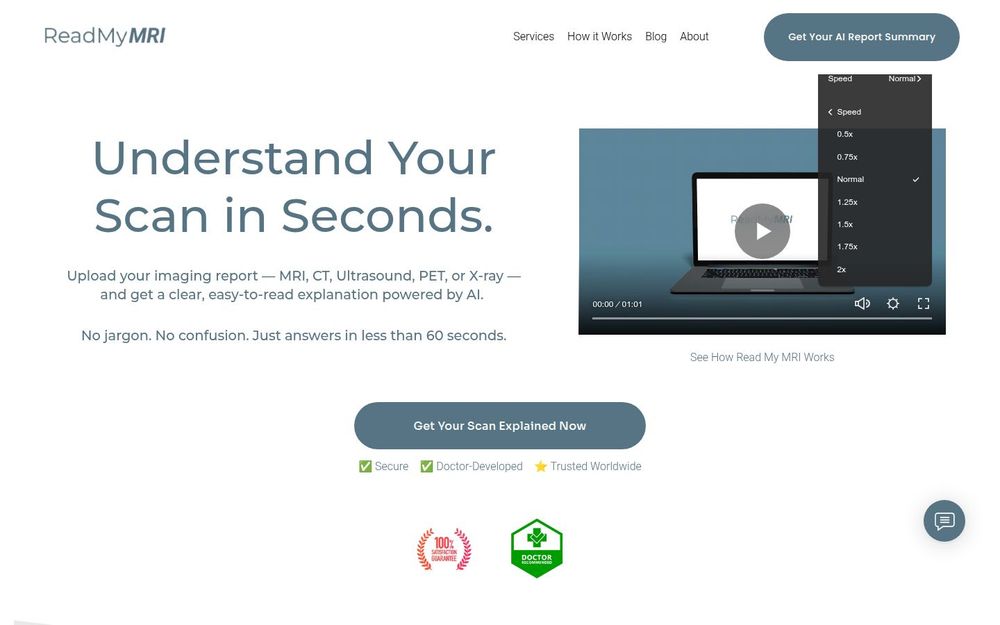 Read My MRI 是一款专为患者设计的 AI 影像报告解读工具,其目标是将晦涩的放射学报告转变为简明、可操作的健康信息。该服务支持多种影像类型(MRI、CT、超声、X 光、PET),由医生参与设计并由人工智能驱动,能够在短时间内为用户生成个性化的报告摘要,帮助患者在就诊前、就诊中或就诊后更好地理解自身的检查结果。