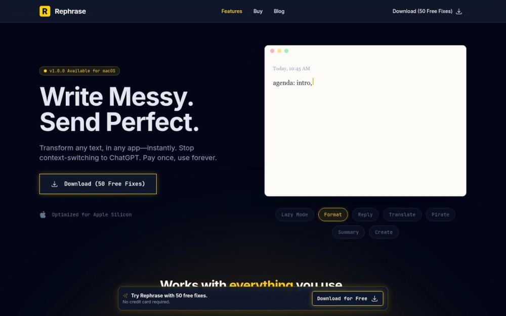 Rephrase 适合经常需要写邮件、整理笔记或在多人协作工具中频繁沟通的用户。它通过 减少上下文切换、保持键盘驱动的工作流,以及 一次性付费的无订阅模式,为注重工作流效率和长期成本控制的用户提供吸引力。若你希望在 macOS 原生环境下快速提升文字质量并保证隐私,Rephrase 是一个值得尝试的轻量化方案。