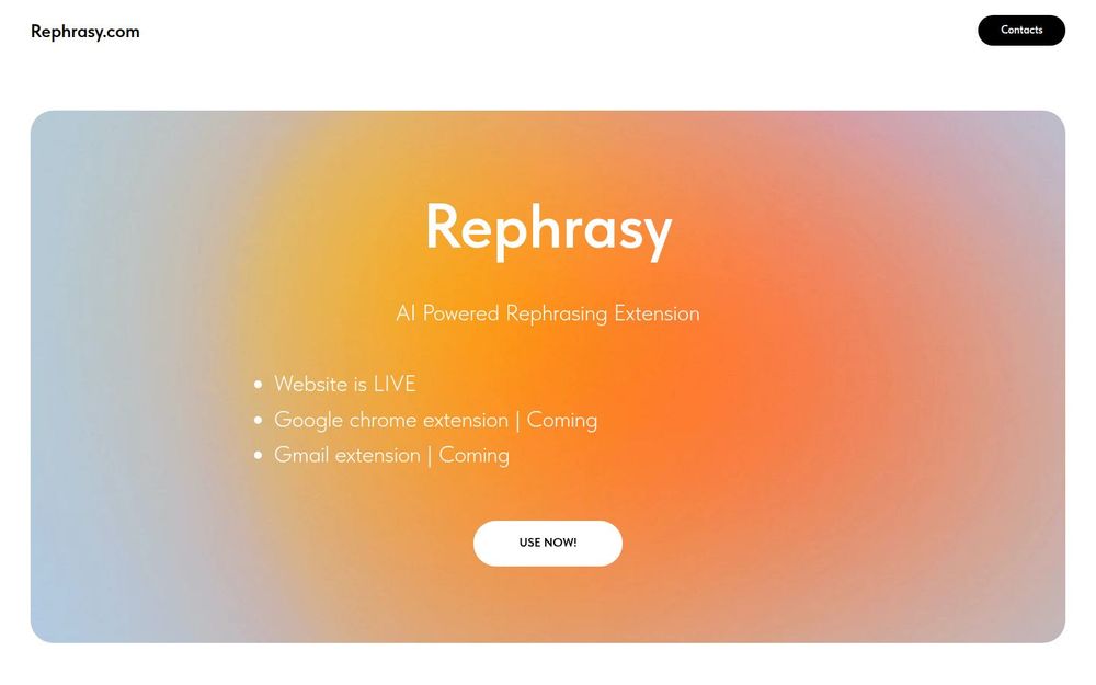 Rephrasy 是一款以 AI 驱动的重述(改写)扩展 为核心的文字工具,官网标明为“AI Powered Rephrasing Extension”。当前网站已经上线(Website is LIVE),但官方的 Google Chrome 扩展 与 Gmail 扩展 仍处于待发布状态(Coming)。主页提供了“USE NOW!” 的跳转,指向另一个在线改写工具(Word Swap Helper),并且整个产品页面使用 Tilda 平台构建,体现了产品轻量化与快速迭代的特性。