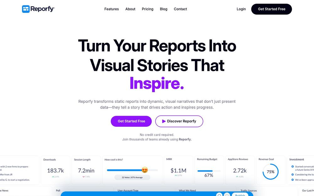 总之,Reporfy 将可视化设计、AI 智能与团队协作结合,旨在把数据转成可读、可行且有影响力的故事,适合希望提高报告质量与传播效果的现代团队使用。