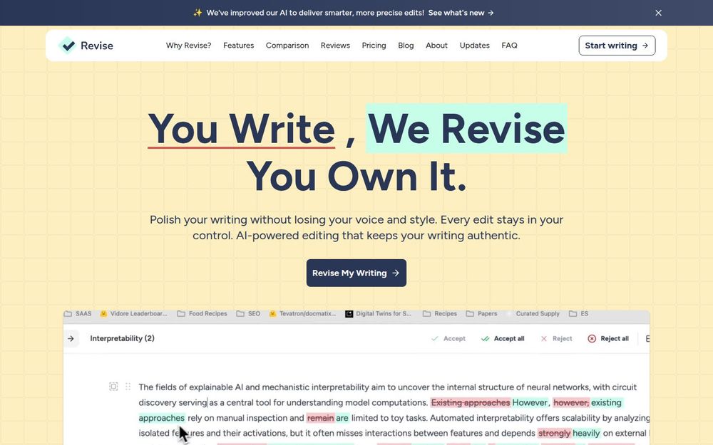 - 学习用户写作声音: 通过使用与训练,Revise 会逐步匹配你的语调、措辞与个性化习惯,使建议更贴合你本人的风格。