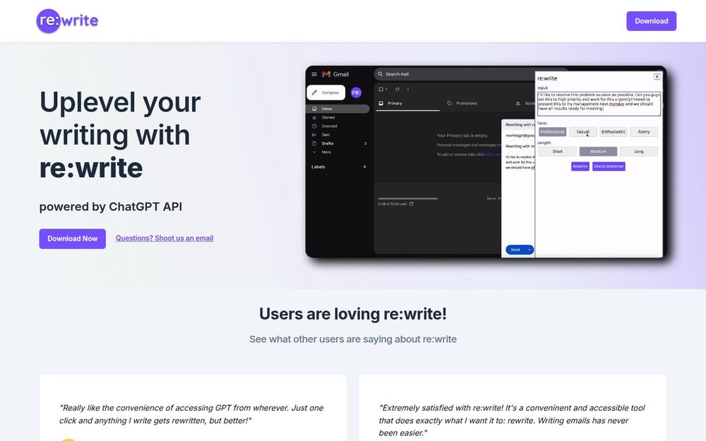 re:write 是一款基于 ChatGPT API 的 Chrome 浏览器扩展,目标是帮助用户在网页环境中快速重写和优化文本。通过安装扩展,用户可以在任意输入框内以“一键”方式调用 AI 助手,对邮件、文章段落、社交媒体发布、评论或其他文本进行风格调整、措辞优化和语气转换。该产品以简单易用为设计核心,强调 即时性 与 实用性,并以免费模式提供给广大用户试用与长期使用。