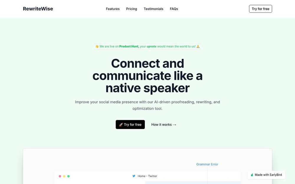 RewriteWise 是一款以 Telegram 机器人形式提供的 AI 写作辅助工具,旨在帮助非母语者在社交媒体上用接近母语的方式表达自己。它结合校对(proofreading)、**改写(rewriting)与内容优化(optimization)**三大能力,重点解决语法、用词、语气与可读性问题,从而提升帖文的专业度与用户互动率。