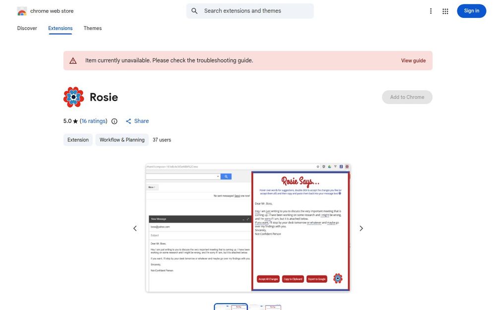 安装后,用户在支持的网站中输入文本,点击浏览器栏的 Rosie 图标即可打开建议面板;悬停可查看替换建议,双击或一键接受更改。扩展当前版本为 1.3(更新于 2018 年 3 月 6 日),体积小(约 195KiB),在 Chrome 商店显示评分 5.0(16 条评分),但实际用户基数较小(显示约 37 名用户)。页面提示“Item currently unavailable”,若遇到无法安装或使用问题,应参照商店的故障排查指南。