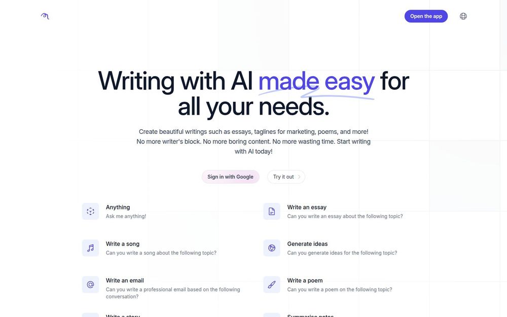 便捷登陆与体验: 提供 Google 一键登录与在线试用入口,用户可快速上手并实时获取写作结果。