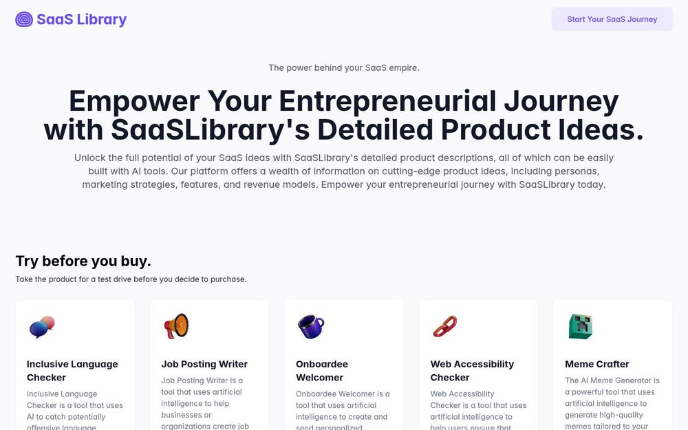 SaaS Library 是一个聚焦于“SaaS 产品点子与AI工具集合”的线上平台,旨在为创业者、产品经理、内容创作者和HR等角色提供可直接使用或改造的产品原型与工具示例。页面通过简洁的卡片式展示,列出了若干基于人工智能的实用工具,并提供“试用”体验与付费解锁更完整的产品描述与模板。