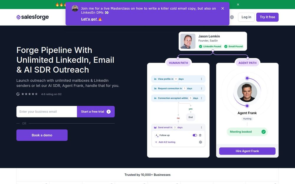 Salesforge 是一款面向企业级和增长型团队的多渠道冷外联平台。它把 邮件(Email)、LinkedIn 和 AI SDR 能力融合到同一套工作流中,强调可扩展性與投递可靠性。平台的核心理念是“可无限扩展的发信能力 + 强化的投递基础设施 + 智能化外联执行”,帮助团队在不受座席限制的情况下构建大规模外联管道。