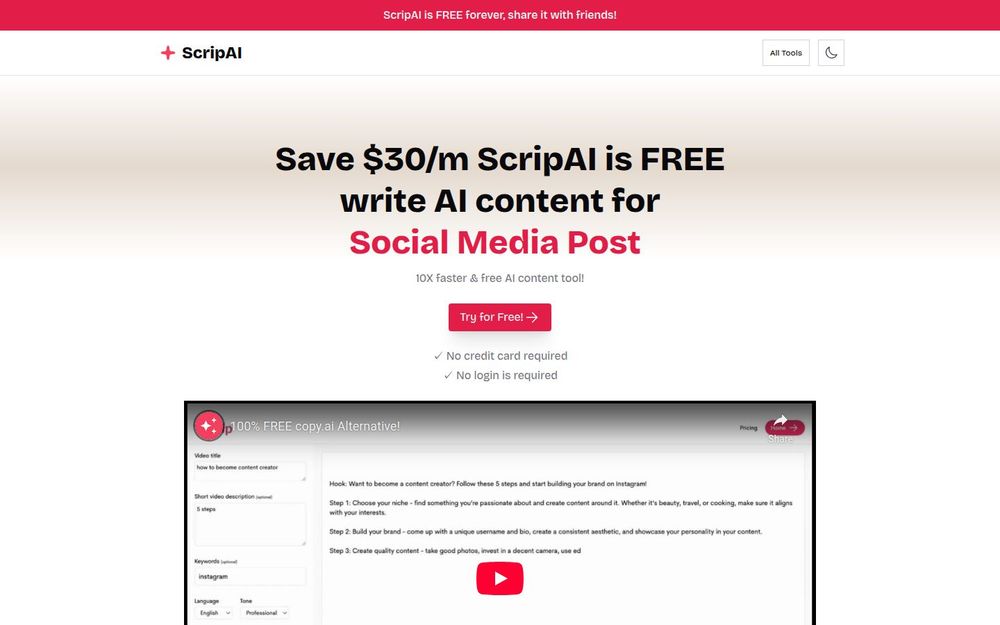 永久免费与免登录:ScripAI 强调所有核心功能对用户开放且不强制注册,适合想快速试用或不愿提供账号信息的用户。
