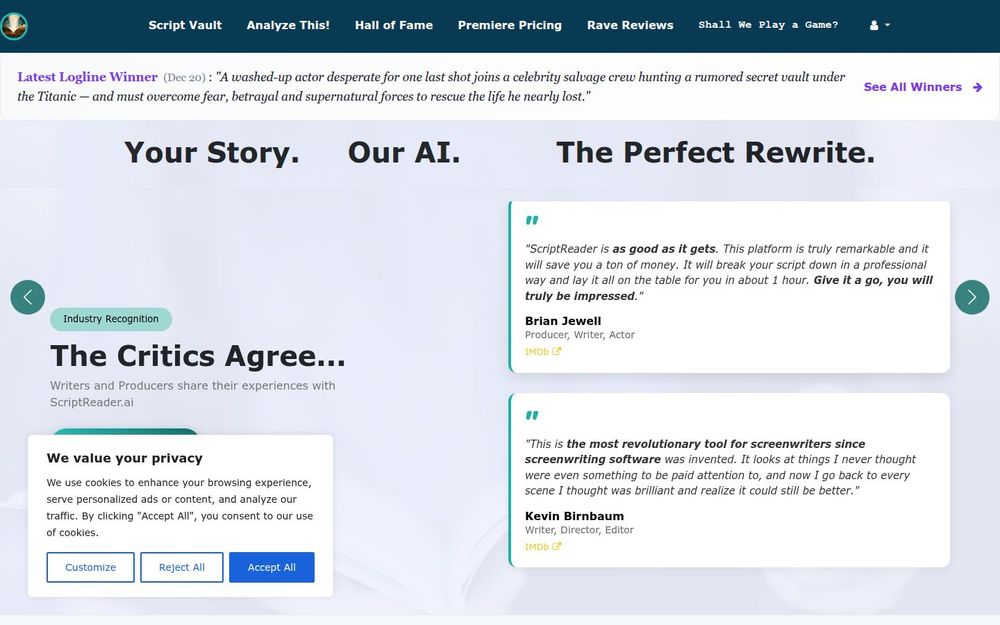 ScriptReader.ai 将专业剧本解析与实用的 AI 工具融合,既能给出行业化的点评(如推荐/通过/考虑等级),又能直接产出可用于推介的物料(海报、短视频、logline)。对于希望在短时间内提升剧本质量、发现盲点并生成推介材料的独立编剧或小型制片团队,ScriptReader.ai 提供了高性价比且操作便捷的解决方案。平台的行业推荐与用户口碑进一步增强了其可信度,使其成为编剧工作流程中值得尝试的辅助工具。