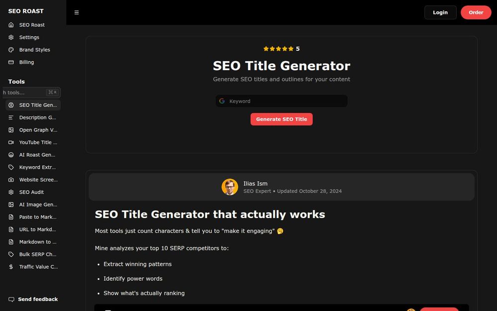 SEO Roast 的 SEO Title Generator 是面向内容创作者与 SEO 专家的智能工具,旨在通过真实的 SERP 数据与多模型 AI 分析来生成高效的页面标题。相比传统只计算字符长度或随机建议的工具,该工具能基于排名靠前的页面模式告诉你哪些词和格式在实际排名中更有效,从而让标题更具“命中率”。它还集成了抓取、分析与大纲生成功能,支持把抓取结果导出为 Markdown,便于后续使用。