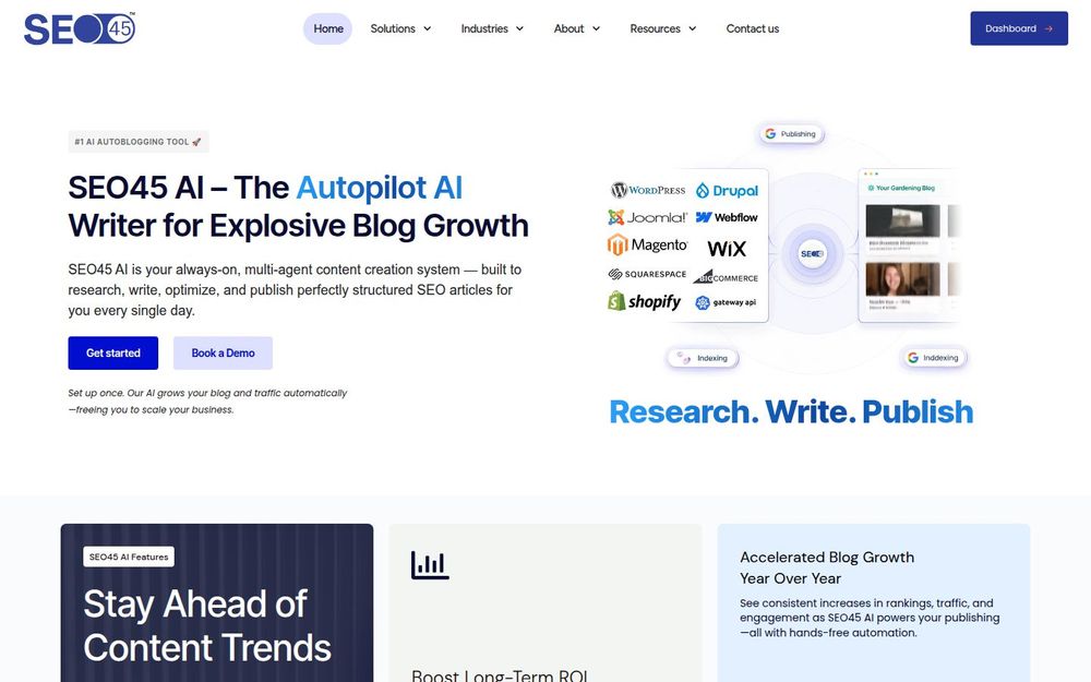 如果你希望把繁重的写作、编辑与发布工作自动化,实现每日稳定更新并有据可查的效果追踪,SEO45 AI 能够通过端到端自动化、多平台发布能力与搜索表现监控三方面显著降低人工成本并提升长期自然流量回报。对于追求规模化内容生产和持续 SEO 增长的组织,这是一套可以日常托管的内容增长解决方案。