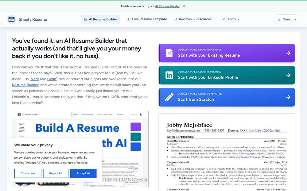 SheetsResume 是由 Nate 与 Colin 创建的在线求职工具套件,核心产品为 AI Resume Builder(AI 简历生成器)。该平台结合创始人多年从事招聘与简历辅导的实战经验与人工智能技术,旨在让求职者用更少时间制作出更具竞争力的简历,从而提升拿到面试的概率。用户可以选择从现有简历、LinkedIn 文件或从头开始填写信息,快速生成专业模板并进行定制。