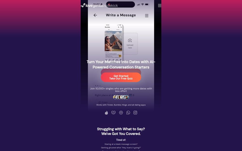 Sidekick 是 LoveGenius 提供的一款 AI 约会助手,专注于将线上配对转化为线下约会。通过分析你的个性和对方资料,Sidekick 提供量身定制的开场白、后续回复建议与个人资料优化方案,帮助用户在短时间内提高匹配率并维持有吸引力的对话节奏。它兼容主流约会平台,且提供免费测验快速上手。平台同时承诺隐私保护,使用银行级加密并在 30 天后删除用户数据。