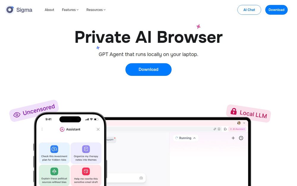 Sigma(Sigma AI Browser)是一款把“浏览器”与“智能代理”结合起来的产品,核心目标是提供一种私有、安全、可离线运行的 AI 浏览体验。它以 本地 LLM(Local LLM) 为核心,在用户设备上处理模型推理与关键数据,从而减少对云端依赖和外部数据泄露风险。Sigma 在保留 Chromium 兼容性和易用性的同时,加入了多项面向生产力与自动化的功能,适用于研究、写作、电子邮件清理、预订与电商自动化等场景。