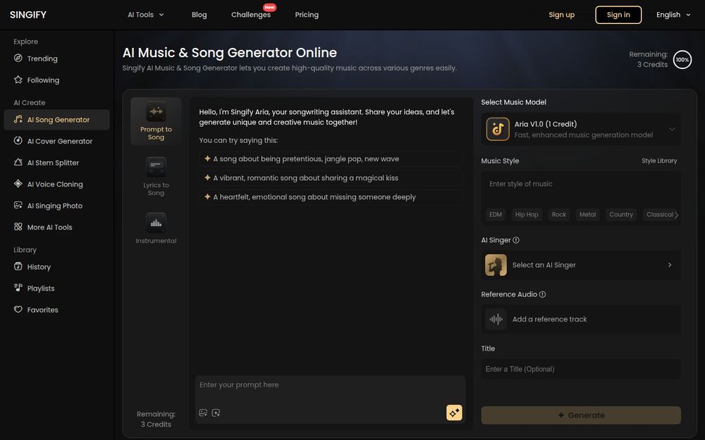 Singify 是一款面向大众与专业创作者的 AI 音乐与歌曲生成平台,旨在通过人工智能将灵感快速转化为可用的音乐素材。用户可以通过输入文本、歌词,或上传图片、视频和参考音频,一键生成风格各异的歌曲或背景音乐。平台内置多种音乐模型与 AI 歌手,同时提供与后期制作相关的工具,帮助用户从创意到成品实现无缝衔接。