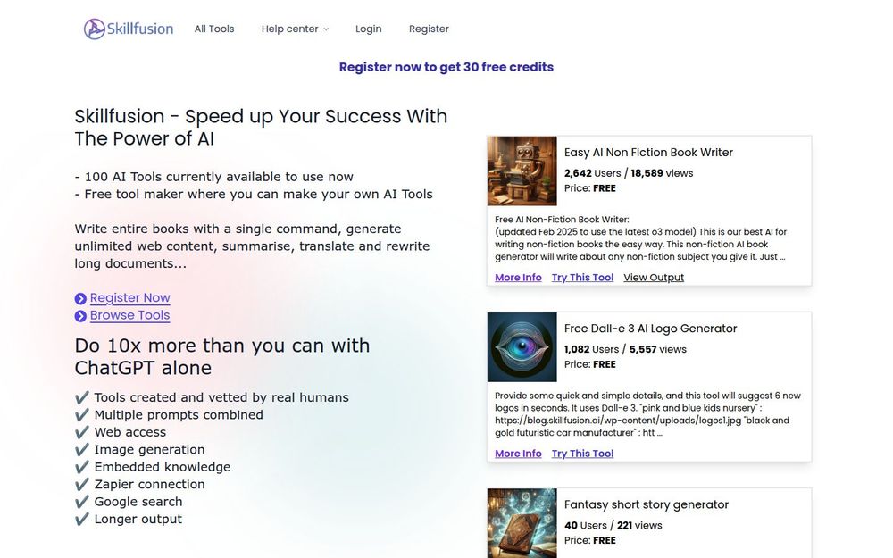 Skillfusion 将海量预设工具、灵活的工具制作能力与多模态 AI 集成结合在一起,适用于从个人创作者到企业级用例的广泛需求。无论你需要写一本书、生成高质量营销素材,还是构建可复用的 AI 工作流,Skillfusion 都提供了便捷的入口、免费试用选项与市场化路径,让 AI 更快地助力实际生产力提升。