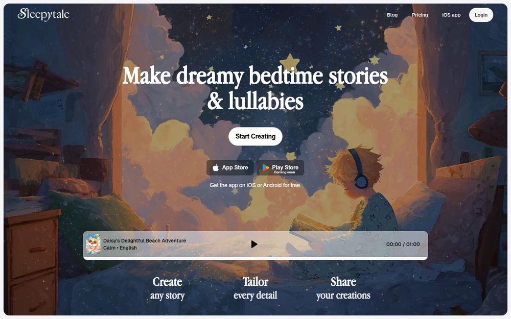 Sleepytale 是一款专注于儿童睡前体验的 AI 平台,通过先进的生成模型创作原创睡前故事与摇篮曲。用户可在几秒钟内生成量身定制的故事,选择语音、语言、情绪基调与故事长度,实现高度个性化的听觉与阅读体验。平台兼容多种设备(手机、平板、电脑、智能音箱等),并支持将故事转换为带插图的电子画册或订购高品质的精装实体书。