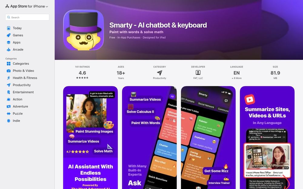 Smarty 是由 FAT, LLC 推出的 AI 辅助键盘与聊天机器人应用,目标是把强大的生成式 AI 能力直接嵌入系统键盘,让用户在任何应用中都能即时获得写作建议、翻译和内容摘要。它兼容 iPhone、iPad、Mac 等多平台,支持多种语言界面,并以简洁的交互帮助用户提升信息表达效率与沟通质量。