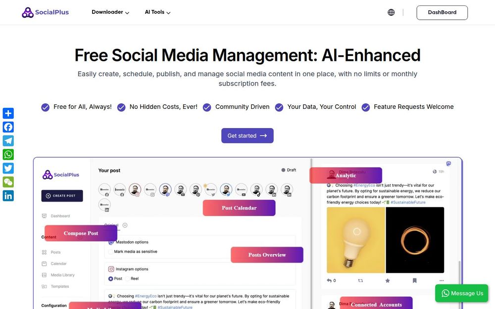 SocialPlus 适合希望在不承担订阅费用且强调数据隐私的前提下,统一管理多平台社媒账号的用户或团队。它提供从内容创作、模板复用、媒体管理到排程发布与分析的一体化流程,并通过社区驱动快速响应平台支持与功能请求。对于注重可控性、成本效率与隐私合规的使用者而言,SocialPlus 是一个值得尝试的工具。