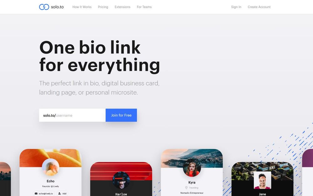 统一链接聚合: 将 Instagram、TikTok、YouTube、Spotify、SoundCloud、Behance、Dribbble、Etsy 等多个平台的链接整合到一个页面,用户只需分享一个 solo.to/用户名 即可。