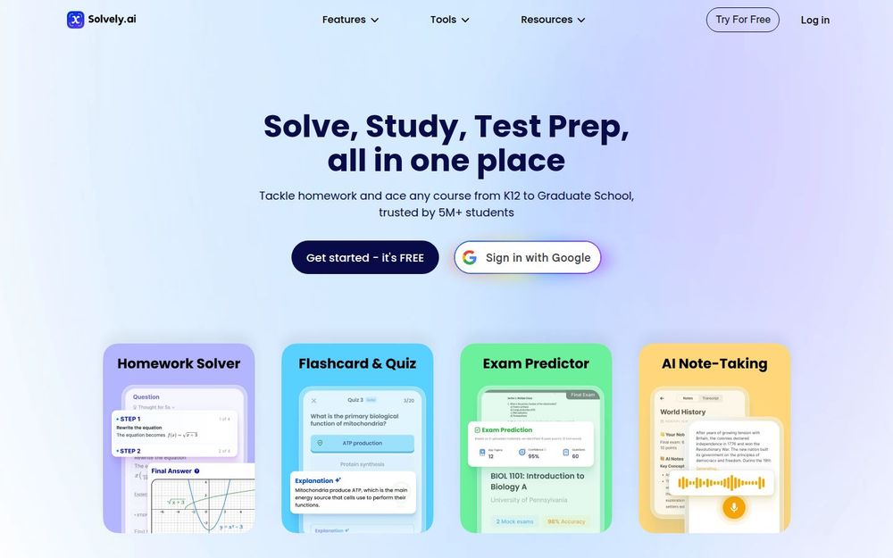 Solvely 是一款聚焦于作业辅导与考试备考的 AI 学习平台,面向从小学到研究生的各个学习阶段。它集成了拍照识题、文字题解析、测验生成、作文辅助与课堂笔记转写等能力,并提供移动端应用和浏览器扩展,方便学生在多个学习场景中随时使用。平台主打逐步解题与可追问的交互式答疑,旨在不仅给出答案,更帮助用户理解解题过程。