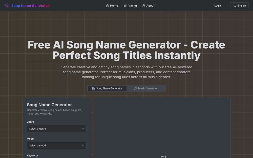 Song Name Generator 是一款专为音乐创作者设计的 AI 驱动歌曲标题生成器,旨在通过自动化和智能化的方式,帮助用户快速获得契合作品风格与情绪的标题创意。无需注册即可使用基础功能,界面简洁、响应迅速,支持桌面与移动端访问,适合需要大量创意名字或克服写作瓶颈的音乐人与内容创作者。