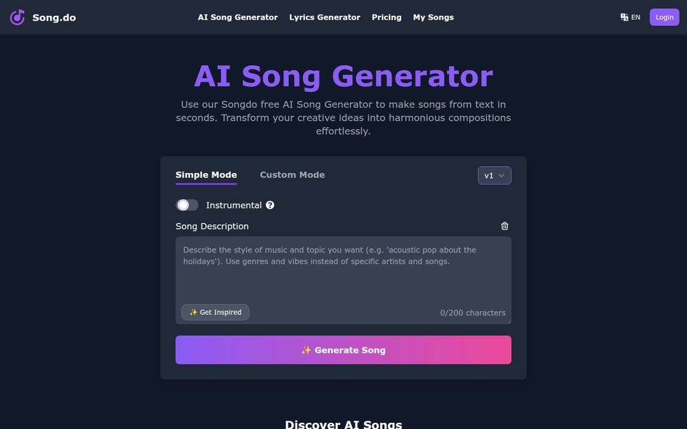Song.do 是一款面向大众的 AI 歌曲生成器,通过自然语言提示将想法转化为完整音乐作品。无论是从零开始用文本描述音乐氛围,还是把已有歌词一键变成带有人声与伴奏的成品,Song.do 都能在数秒到数分钟内产出可试听、可下载的 MP3。平台同时提供多种模型版本与订阅选项,以满足不同音质、时长和创作深度需求。