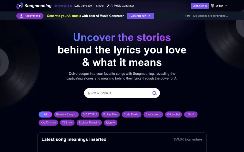 Songmeaning 是一个面向音乐爱好者和创作者的在线平台,致力于通过人工智能与社区贡献揭示歌曲歌词背后的故事与含义。网站既像一个庞大的歌曲释义数据库,也提供歌词翻译、歌手页面和按日期、字母检索等实用导航。同时,平台还提供**AI 音乐生成(Generate)**功能,支持用户基于 AI 迅速生成音乐片段或获得创作灵感。