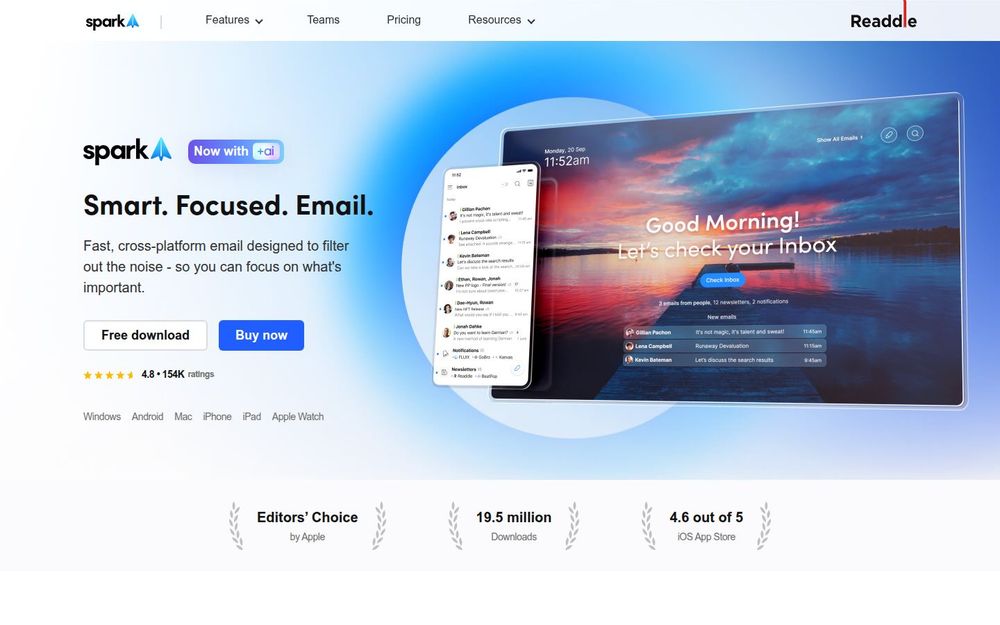 Spark 是一款以“Smart. Focused. Email.”为理念的跨平台邮箱客户端,旨在帮助用户摆脱信息过载、提高工作专注度与沟通效率。它支持 Windows、macOS、iPhone、iPad、Android 及 Apple Watch,多账户无缝同步,并在用户体验与生产力工具上不断迭代。除了常规的收发邮件功能,Spark 强调通过智能分拣、自动化和协作功能来重构邮箱使用方式。