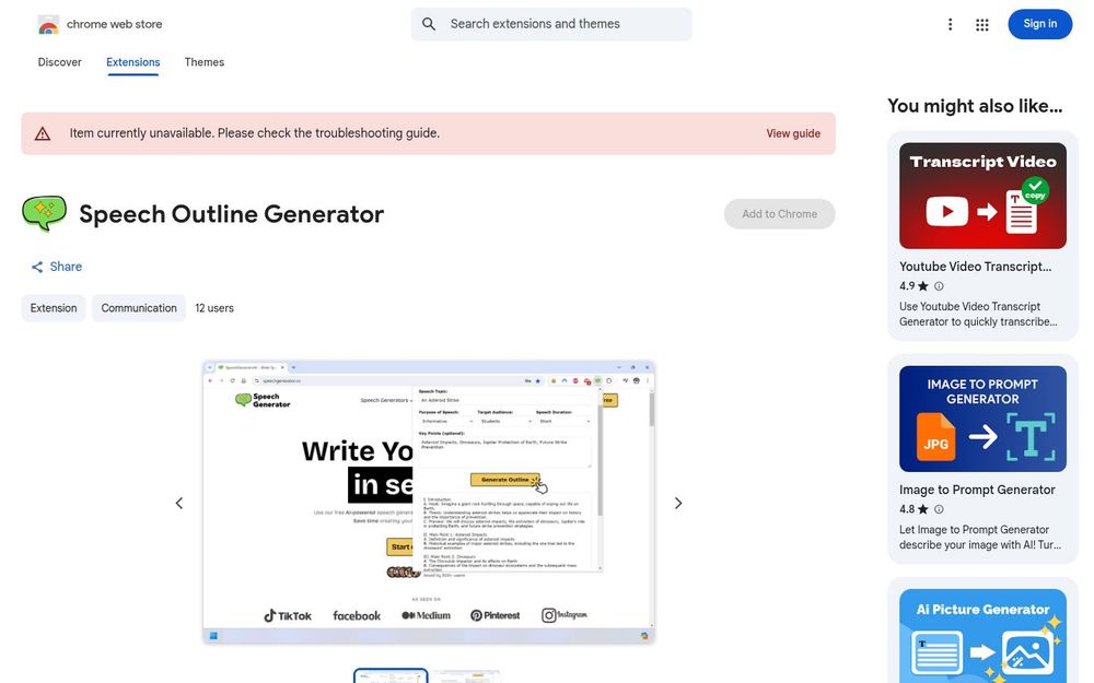Speech Outline Generator 是一款由 Stargazer Media LLC 提供的 Chrome 浏览器扩展,旨在帮助用户快速从零开始构建演讲提纲。无论是学生准备课堂报告、职场人士构思项目陈述,还是婚礼致辞、公开演讲的结构化准备,本工具都能在浏览器中通过简单几步生成清晰、有层次的提纲。页面信息显示该扩展体积小、支持英语,并在隐私部分声明不会收集或使用用户数据,开发者提供支持邮箱与隐私政策链接。