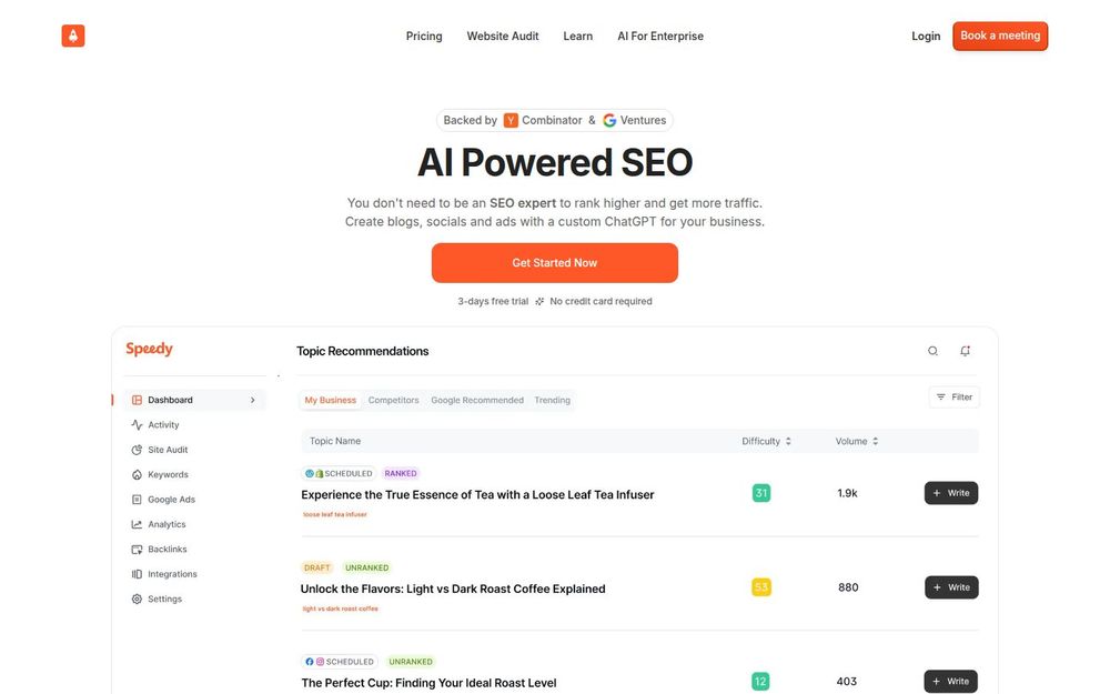 Speedy 是一款以人工智能为核心的内容营销与SEO工具,面向需要提升有机流量、优化搜索排名并加速内容产出的企业与团队。它通过自动化选题、关键词研究、文章生成、社交媒体与广告素材创作等功能,帮助用户在短时间内产出符合品牌语调且经过SEO优化的内容,从而提升内容曝光与转化率。Speedy 提供免费试用,并获得 Y Combinator 与 Google Ventures 的背书。