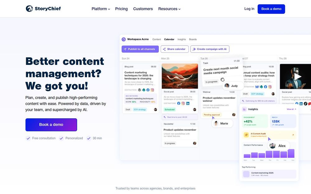 StoryChief 是一款以数据驱动、由团队协作并由 AI 增强的全方位内容管理平台(CMP)。它将内容规划、撰写、优化、审批与分发整合到一个统一的工作区,适用于需要跨渠道发布并保持品牌一致性的机构与企业。平台强调提高生产效率、优化搜索与 AI 引用可见性以及简化多人协作与客户审阅流程。