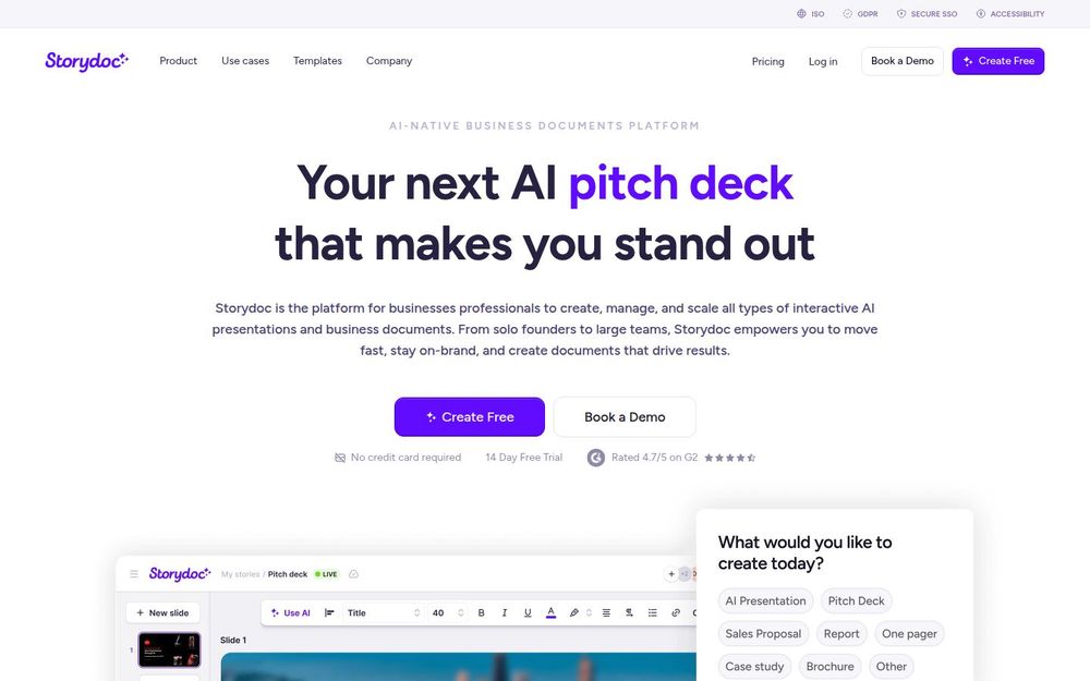 如果你的目标是用更少时间产出更具说服力且可追踪的商务文档,Storydoc 提供了从 AI 辅助创作、互动组件、个性化自动化到深度分析与企业级安全的一体化解决方案,尤其适合追求规模化、品牌一致性与数据驱动优化的团队。