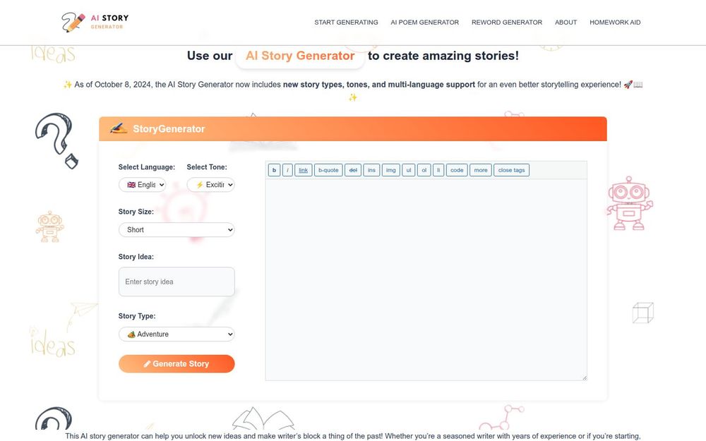 多语言支持: 提供多种语言选项(如英语、西班牙语、法语、中文等),方便不同语种的写作者直接生成目标语言的故事。