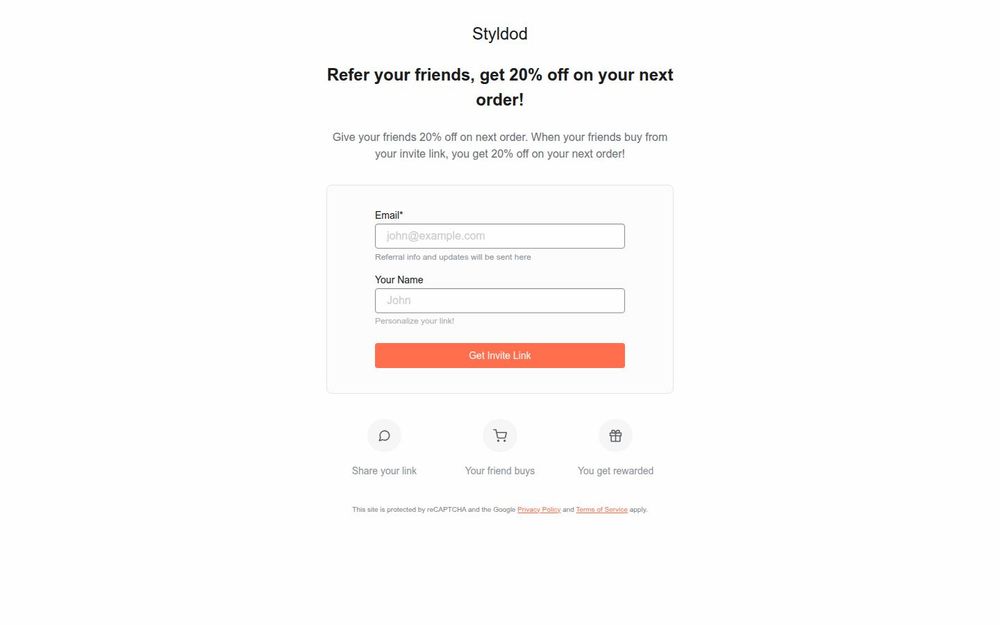 Styldod 的推荐计划是一项面向现有用户和新用户的促销机制,旨在通过用户之间的分享来扩大品牌影响力,同时给予双方实际的购物优惠。用户可以通过填写电子邮件、个性化邀请链接并分享到社交平台或私域渠道,当朋友通过该链接完成购买后,邀请人将在下一次订单中获得 20% 的折扣,被邀请人同样可获得 20% 的优惠,实现双向激励。