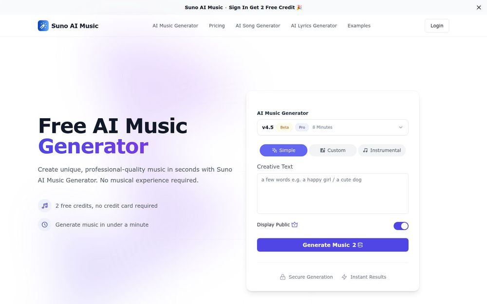快速生成: 在数十秒到几分钟内生成完整音乐片段,节省传统编曲与制作的时间成本。