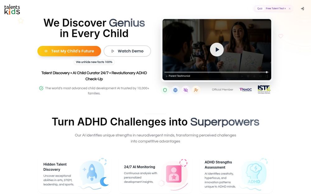 Talents.Kids 是一款以人工智能为核心的儿童天赋发现与发展平台,面向家长、教师与教育机构。平台通过多模态数据(如作业、绘画、视频等)输入,由 35+ 个 AI 代理协同工作,利用多种科学模型在极短时间内构建儿童的“天赋 DNA / Talent Graph”。Talents.Kids 强调科研支撑与教育标准對齊,并获得 NAGC 与 ISTE 的支持,主张把先进 AI 与经验证的教育学结合,特别关注 ADHD 与神经多样性儿童的优势识别与执行功能评估。