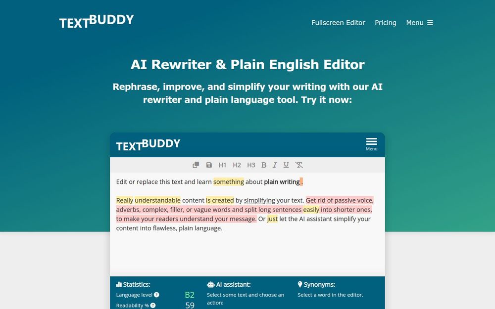 Textbuddy 是一款以“清晰易懂”为目标的在线文本编辑与改写工具,融合了文本分析器与 AI 重写助手。它侧重于将长句、被动语态、填充词或复杂术语简化为plain language(简明语言),帮助作者在更短时间内产出更易理解的内容。产品面向写作者、客户支持、市场和教学等需要提高文本清晰度的场景。