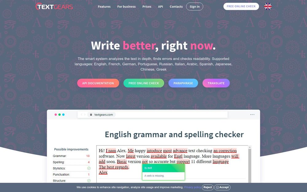 如果你需要一套既能为个人写作者提供即时反馈,又能通过 API 为产品级应用提供稳定校验能力的服务,TextGears 是一个兼顾功能深度与企业级需求的选择。它不仅注重语法与拼写纠错,还关注可读性评估与词汇分析,并提供灵活的计费和部署方案,适合教育机构、内容平台及需要高并发文本处理的企业使用。