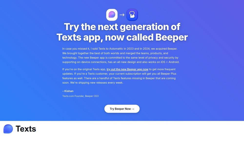 Texts 是一款面向多平台消息整合与效率提升的应用,其核心理念是把来自 iMessage、WhatsApp、Telegram、Signal、Messenger、X、Instagram、LinkedIn、Slack 和 Discord 等渠道的消息统一到单一界面中进行管理。产品强调 隐私优先,通过设备端连接直接与各消息平台交互,声称消息不会存储在 Texts 服务器上,并采用加密传输,同时以订阅制盈利而非以用户数据变现。自 2023 年将 Texts 卖给 Automattic 后,团队在 2024 年并入 Beeper,用户被建议迁移到新的 Beeper 应用以获得更多更新和功能整合。