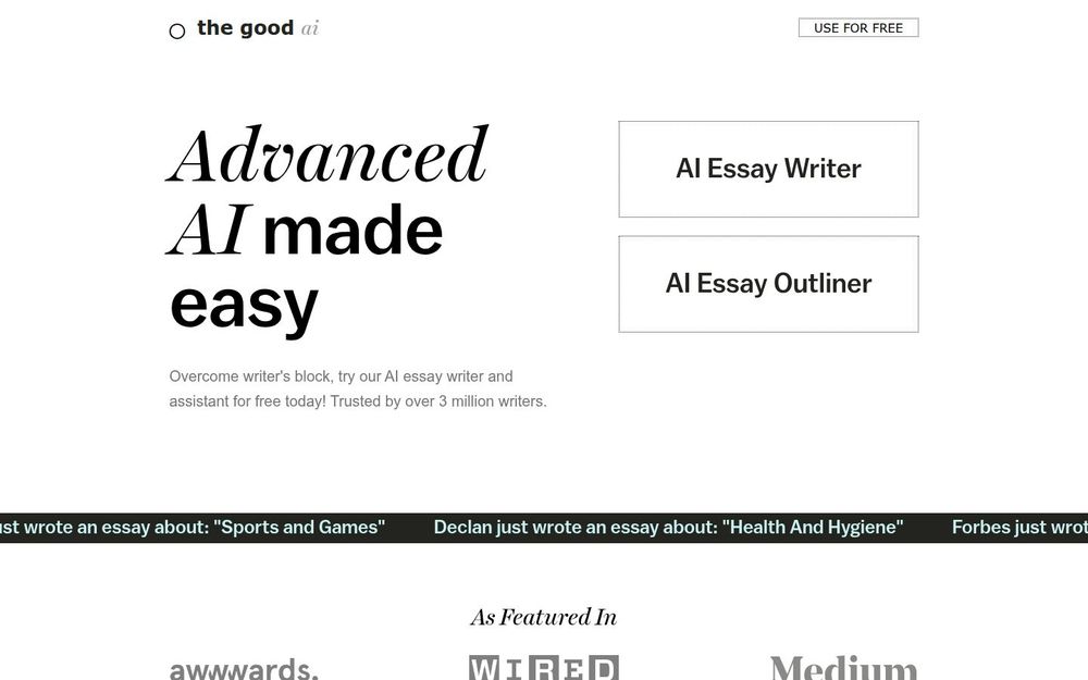 The Good AI 是一款面向学生、写作者和内容创作者的在线写作辅助产品,主打 AI 作文生成器 与 作文提纲(Essay Outliner)。网站提供免费试用入口,声称基于大量高质量范文训练,能够快速生成符合主题、类型与语气要求的作文,帮助用户从选题、列纲到写作和润色的整个流程更高效地完成写作任务。