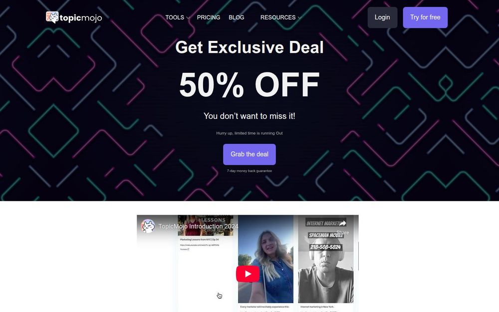 TopicMojo 提供多档订阅(Free、Starter、Pro),不同套餐在查询配额、搜索监听、SEO 数据与团队成员支持上有差异。页面同时展示限时优惠与 7 天退款保证,适合先试用免费或入门套餐,再按需升级到 Pro 以获得无限制查询与更多团队功能。