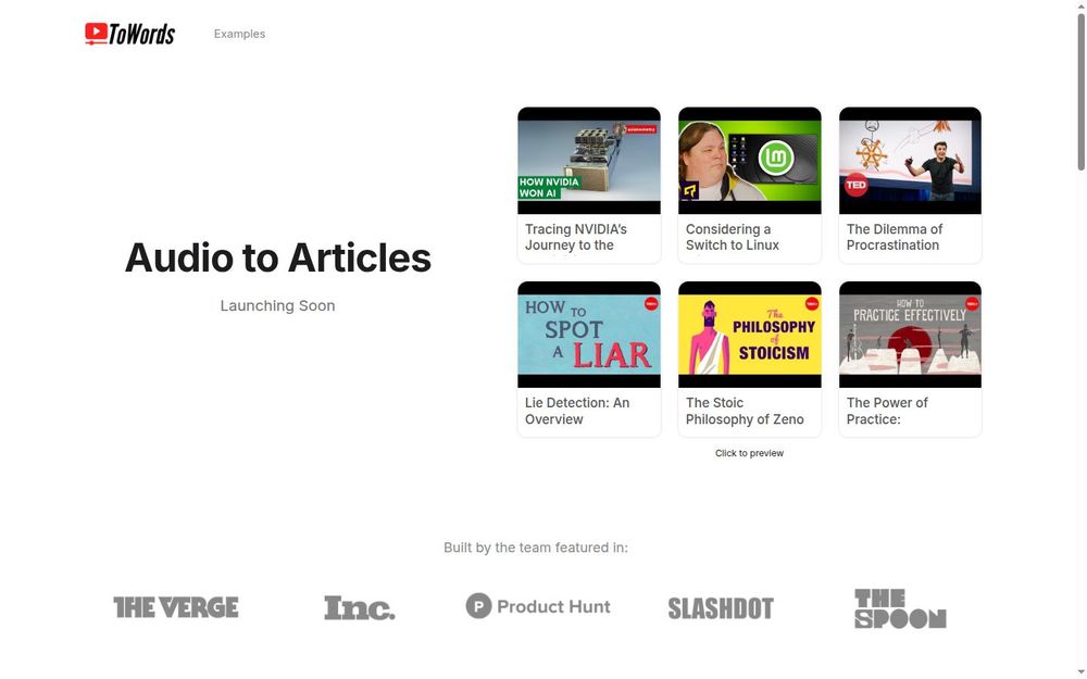 ToWords 是一个专注于将音频和视频内容转化为高质量文章的创新平台。它的目标是帮助用户快速生成引人入胜的 SEO 友好内容,适用于各种场景,包括 YouTube 视频、播客、会议录音等。